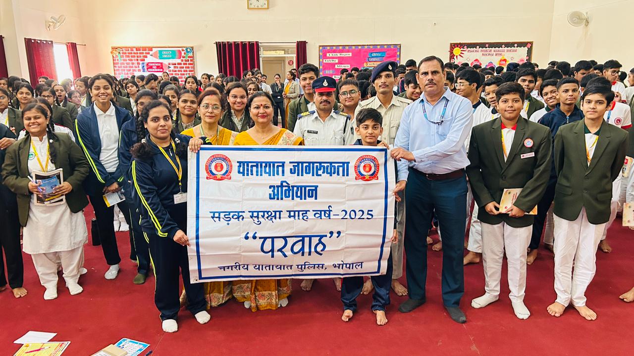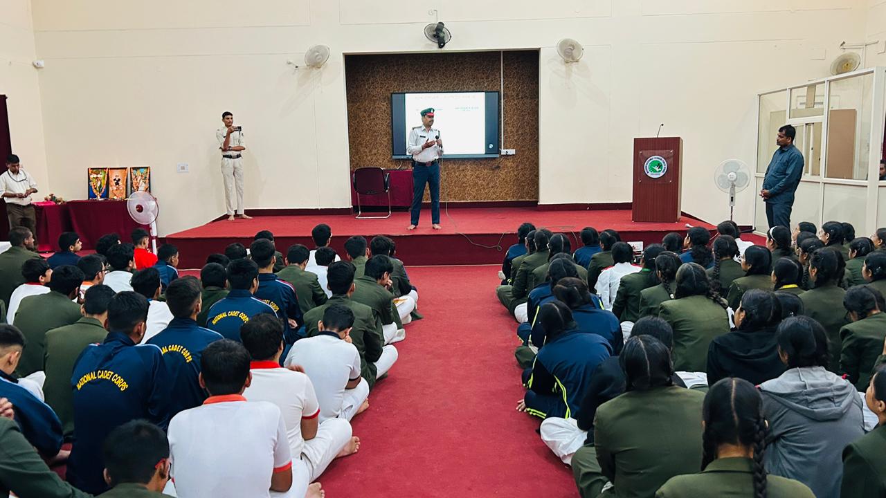 During the session, Shri Saraswat sensitized the students about the importance of following traffic rules and maintaining road discipline to ensure personal and public safety. He highlighted the common causes of road accidents and emphasized responsible behavior as pedestrians, cyclists, and commuters.
