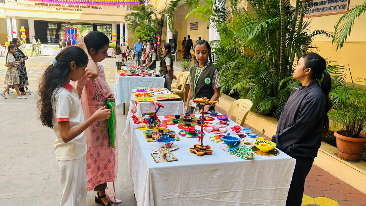The spirit of festivity and creativity illuminated Navnidh Hassomal Lakhani Public School as students from Grades III to IX showcased their artistic talents in a vibrant Diwali Exhibition held on 11th October 2025 during the Parent–Teacher Meeting. The event provided a wonderful platform for students to express their imagination through beautiful handmade creations such as Thali decorations, Torans, Wall Hangings, Matki decorations and many more.