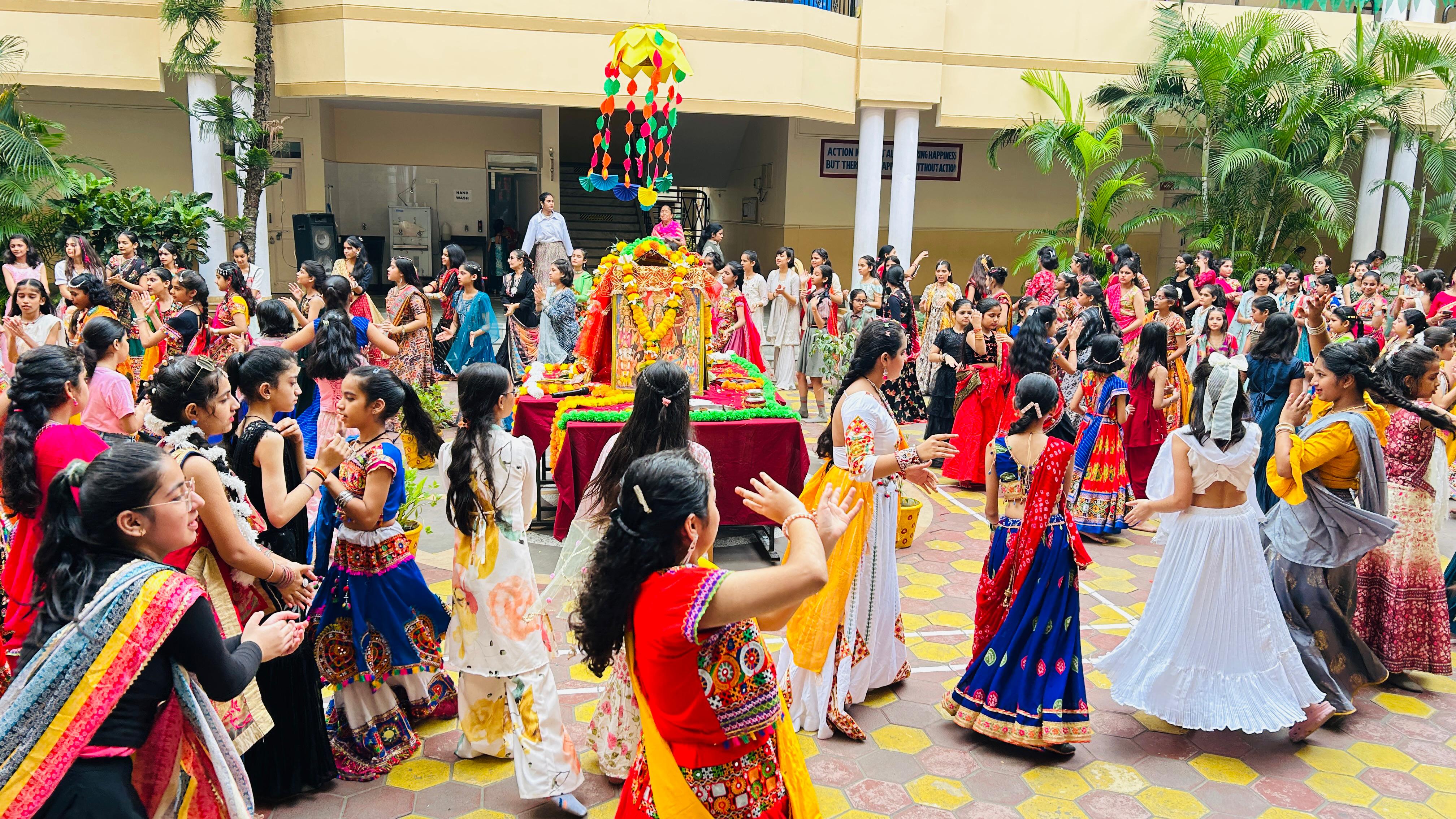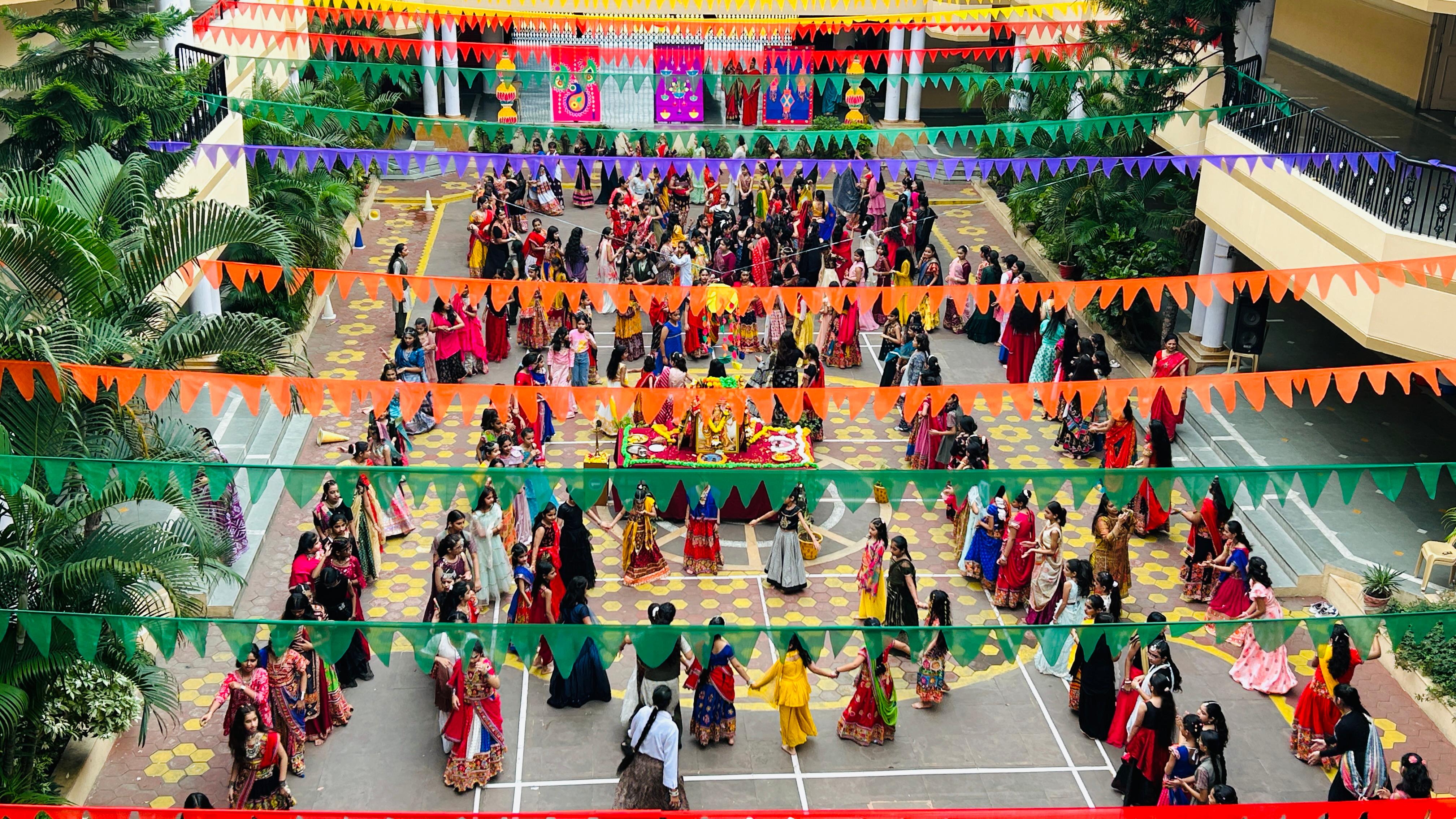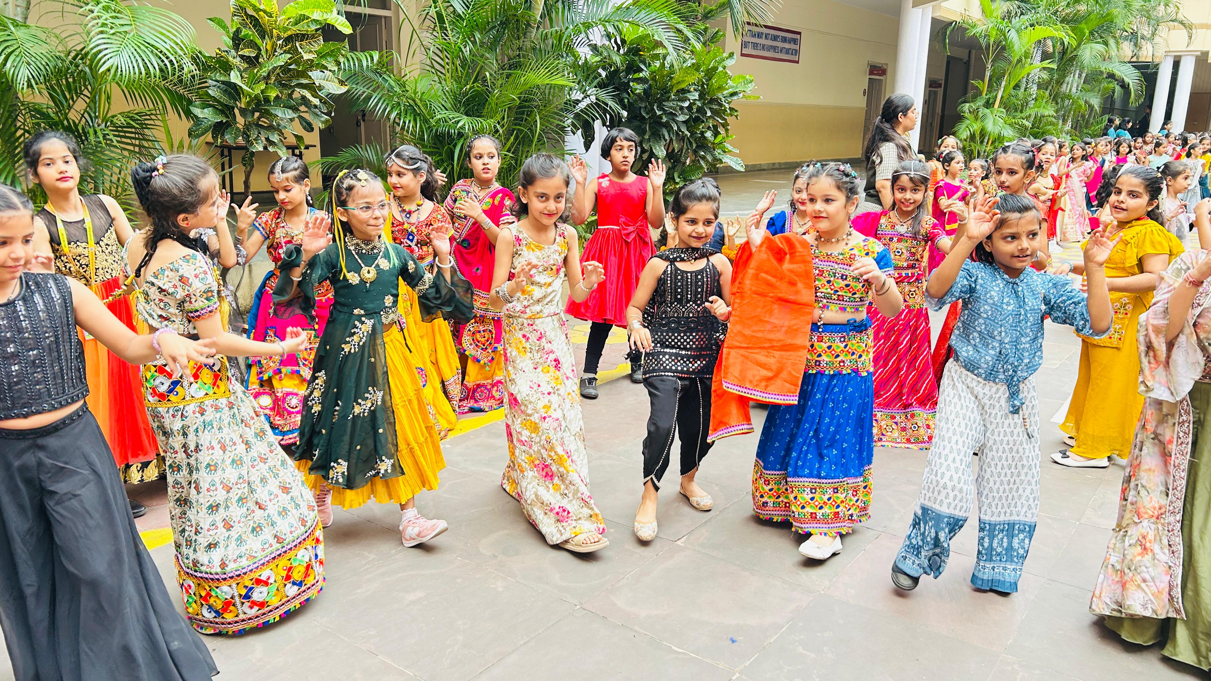 The celebration featured energetic Garba performances across different classes, beginning with students of Std. XI–XII along with teachers setting the tone for the vibrant morning.