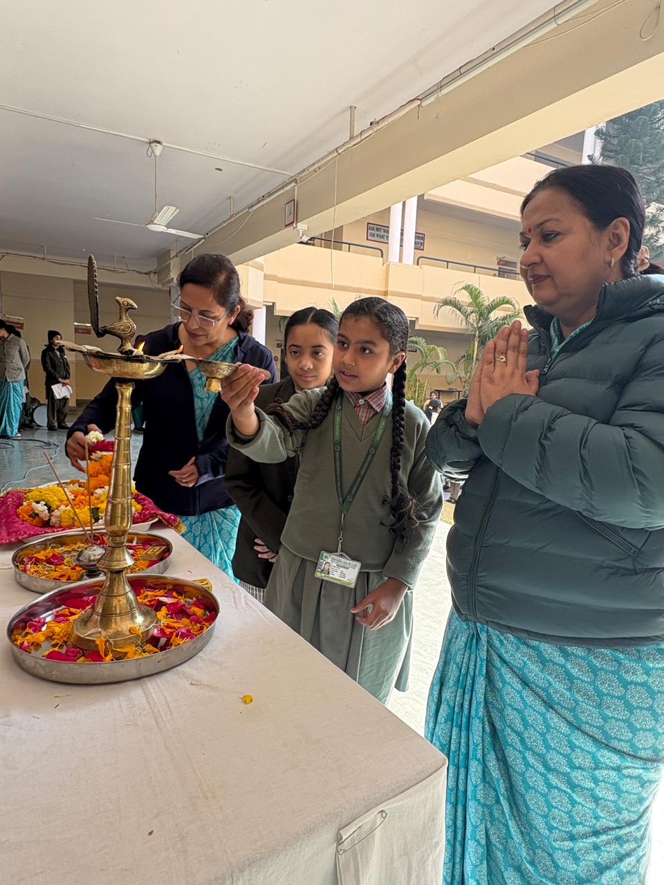 The assembly began with Deep Prajwalan and Vedic mantra chanting, followed by Malyarpan offered by the Principal, Vice Principal, and Coordinators as a mark of reverence.