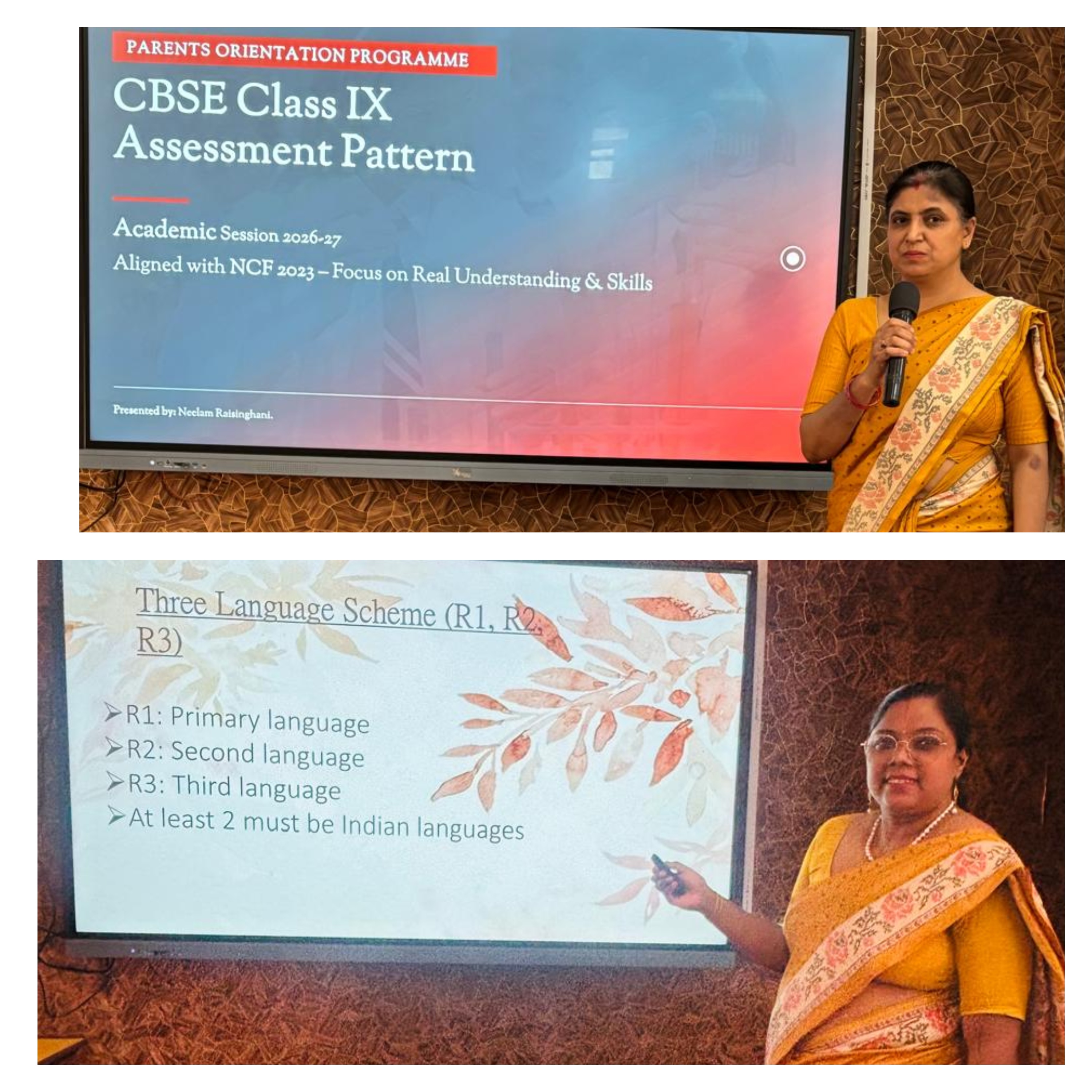 An orientation programme was conducted for the parents and students of Class IX to apprise them of the changes in the curriculum in alignment with NCF 2023 and NEP 2020. The session was graced by the Principal, Ms. Amrita Motwani, who emphasized the crucial role of parents in supporting students and strengthening the school-parent partnership for holistic development. Ms. Rini Sunil, Coordinator, further elaborated on the key modifications introduced across various subjects, highlighting the shift towards competency-based and experiential learning, while Ms. Neelam Raisinghani, Evaluation Incharge, provided clarity on the revised assessment patterns and evaluation criteria, including internal assessments and overall academic expectations. The session served as a meaningful platform to build understanding and foster collaboration between the school and parents for the academic success of students.